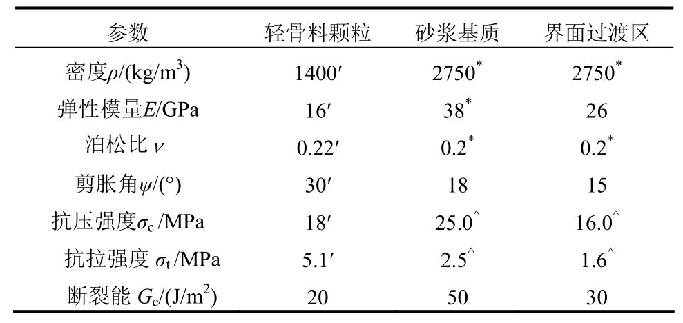 参数 轻骨料颗粒 砂浆基质 界面过渡区密度ρ/(kg/m3) 1400′ 2750* 2750*弹性模量E/GPa 16′ 38* 26泊松比ν 0.22′ 0.2* 0.2*剪胀角ψ/(°) 30′ 18 15抗压强度σc /MPa 18′ 25.0^ 16.0^抗拉强度σt /MPa5.1′ 2.5^ 1.6^断裂能Gc/(J/m2) 20 50 30