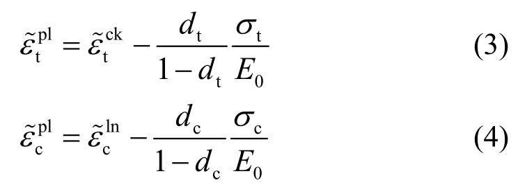 来定义应力-应变曲线的软化阶段,ABAQUS内嵌程序可以按式(3)和式(4)将开裂应变