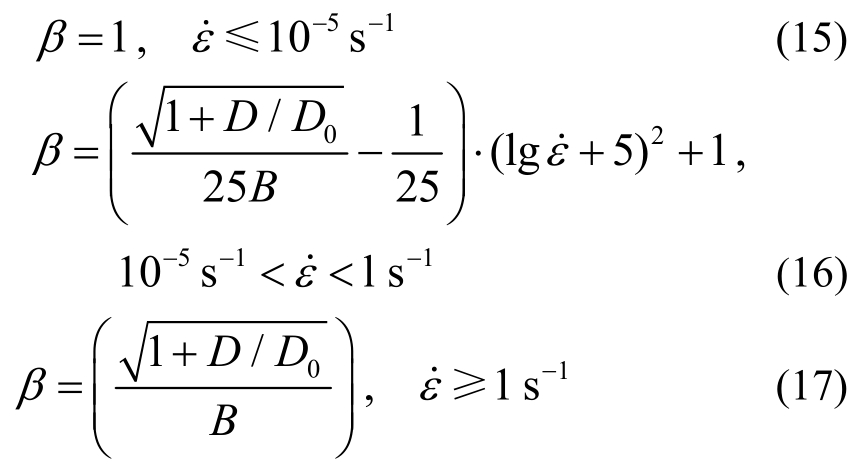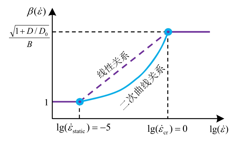 之间时,可采用如图10所示的线性或非线性变化曲线来描述应变率对尺寸效应的影响,这里,暂且采用二次曲线关系来描述应变率对尺寸效应的影响作用,基于该假定及上述分析,可得尺寸效应影响系数β的表达式为: