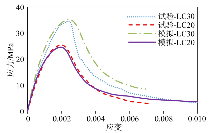 同Bažant等[27]的数值模拟验证方式,本文参考王振宇等[28]开展的轻骨料混凝土力学试验进行模拟对比分析。当采用表1所示力学参数开展二维细观数值模拟时,得到的应力-应变曲线与王振宇等[28]试验结果进行对比,如图2所示。可以发现,轻骨料混凝土强度等级为LC20及LC30时,模拟与试验应力-应变曲线结果吻合良好,初步验证了细观力学方法的可行性及参数选取的合理性。