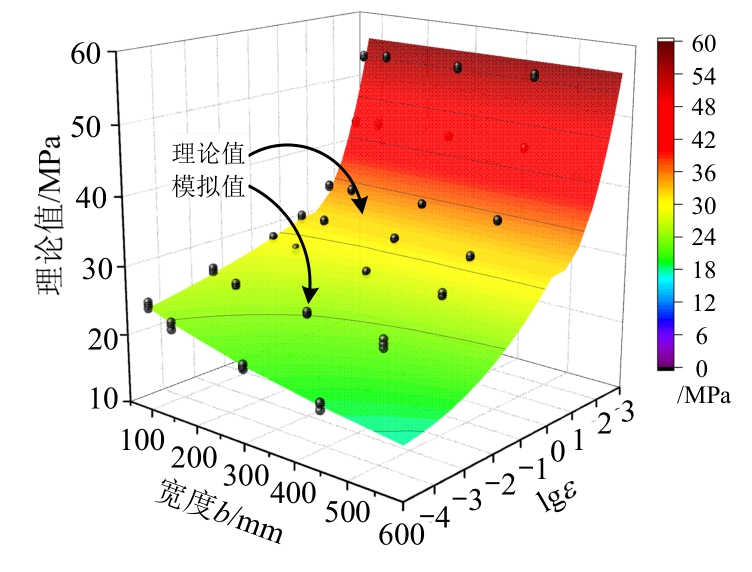 图11为本文所建立的尺寸效应理论公式预测结果与模拟结果的对比情况。可以发现,本文数值模拟动态压缩强度数据点与尺寸效应理论所建立的理论强度曲面吻合良好,表明本文建立的“静动态统一”尺寸效应理论公式可以很好地描述耦合应变率效应的轻骨料混凝土动态压缩强度尺寸效应规律,同时,也说明了此理论公式的合理性。