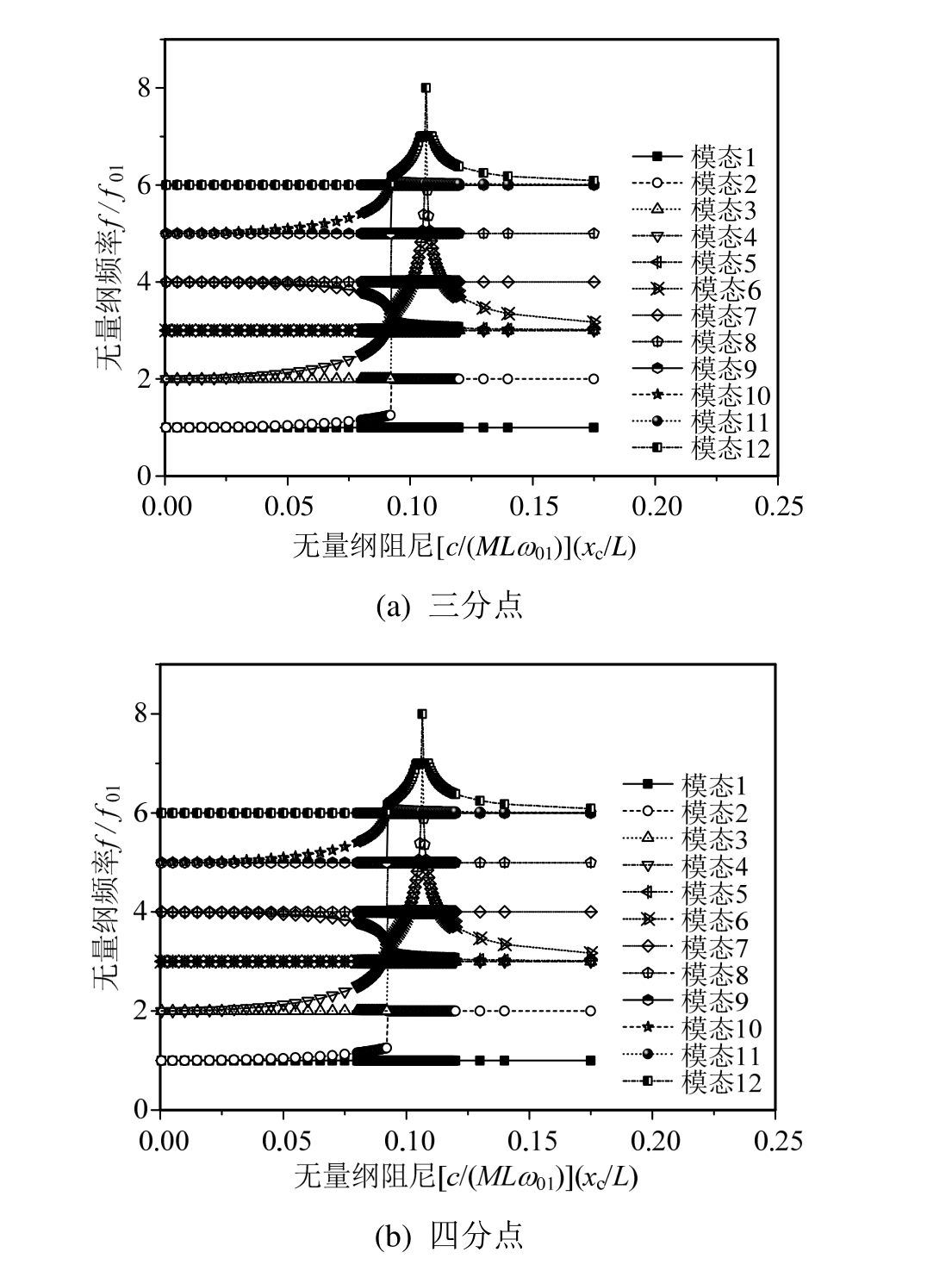 对多个阻尼器安装在三分点和四分点位置(也就是等间距安装2个和3个阻尼器)时的吊索动力特性进行了研究。图8(a)和图8(b)分别给出了在索股之间等间距安装2个和3个阻尼器时吊索-阻尼器结构体系的前 12阶模态的振动频率随阻尼器阻尼系数的变化规律。从图8可以看出,安装多个阻尼器,吊索-阻尼器结构体系的模态频率在无量纲阻尼系数
