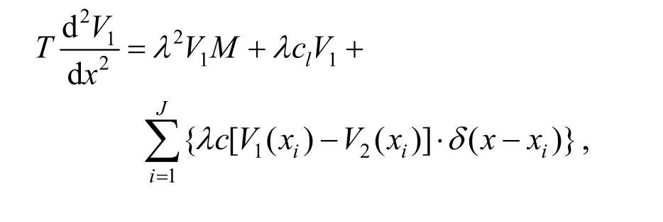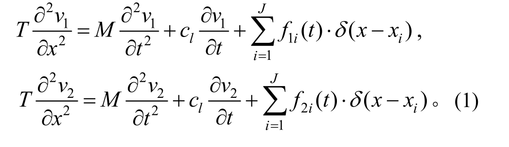 系数股1和索股2在y轴方向位移分别v1(x,t)和v2(x,t)表示,仅考虑索股的面内运动,忽略吊索弯曲刚度的影响,则双索股吊索-阻尼器结构体系的运动微分方程为: