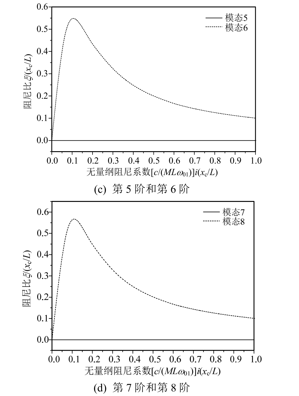 人们在索股之间安装阻尼器,是为了提高吊索的结构阻尼比,从而减小吊索振动。图6给出了单个阻尼器高度xc/L=0.05时双索股-阻尼器结构体系的前8阶模态阻尼比随阻尼器阻尼系数的变化规律。从图6可以看出,阻尼器对于奇数阶(第1阶、3阶、5阶、7阶)模态的阻尼比没有贡献,也就是说,由于第1阶、3阶、5阶、7阶模态的振型中两根单索股的振动完全同向,阻尼器两端的相对位移为零,阻尼器对这些模态不产生模态阻尼比。相比之下,阻尼器对于偶数阶(2阶、4阶、6阶、8阶)模态可实现一定的模态阻尼比,模态阻尼比的大小与阻尼器阻尼系数的大小有关,最优无量纲阻尼比