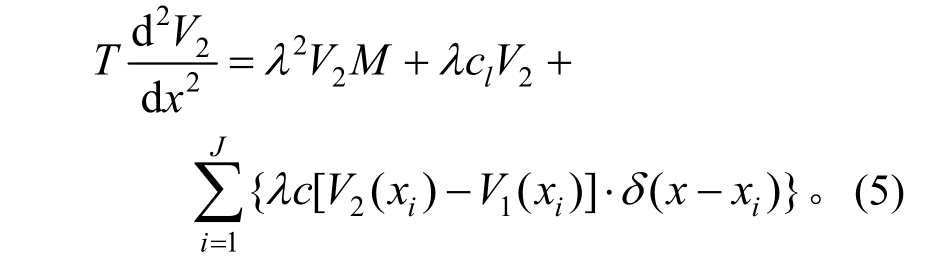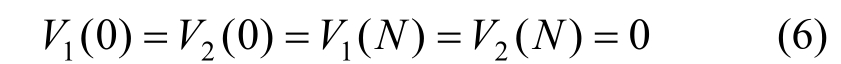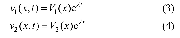 采用分离变量法将方程组式(1)中的空间和时间自变量分离,设v1(x,t)和v2(x,t)可表示为: