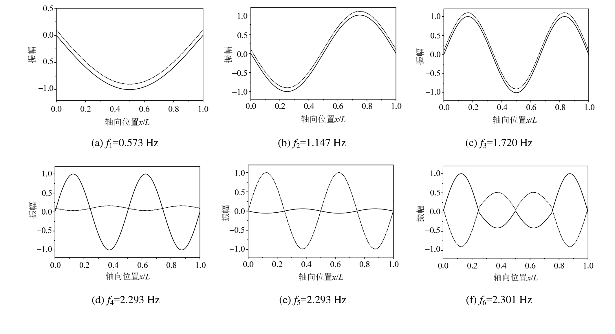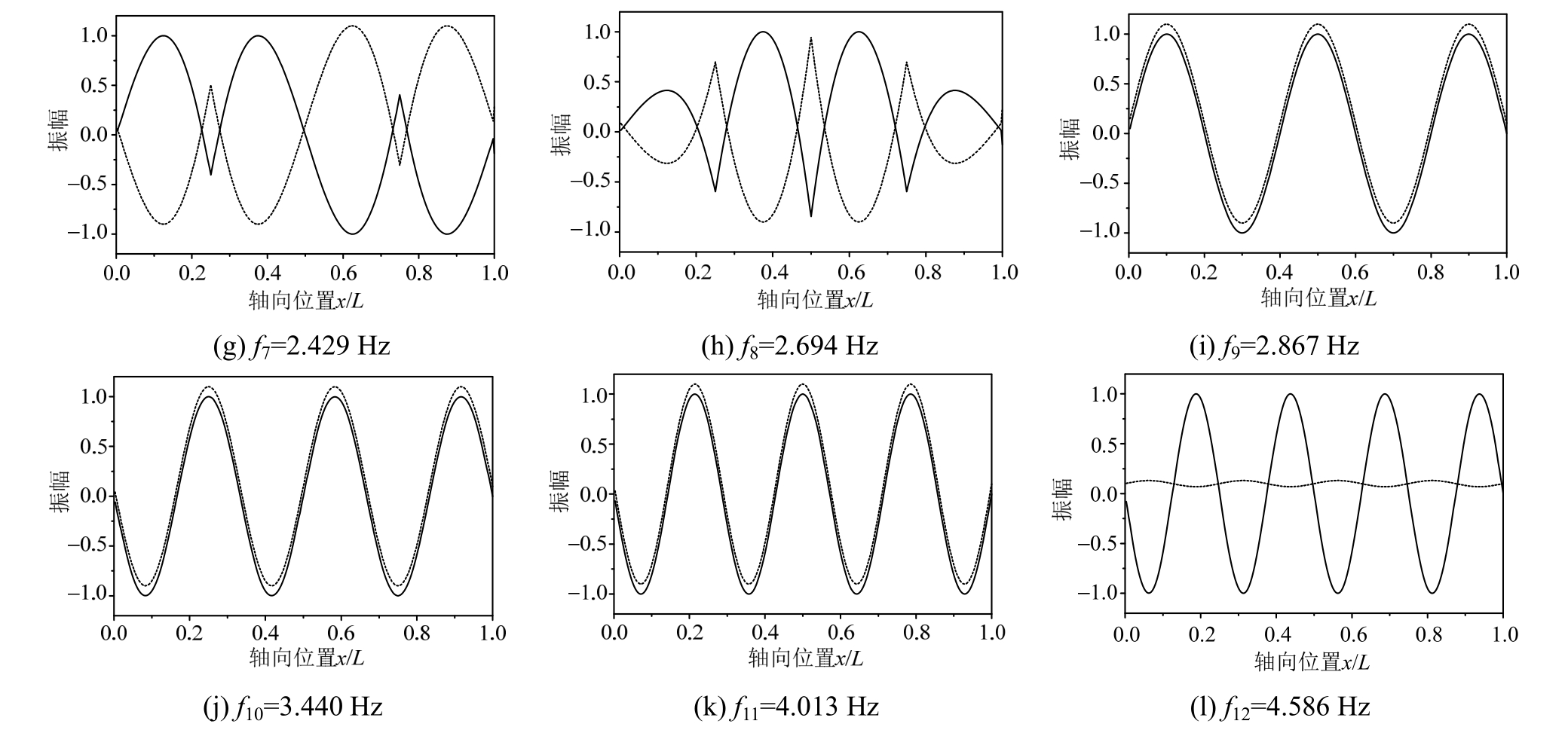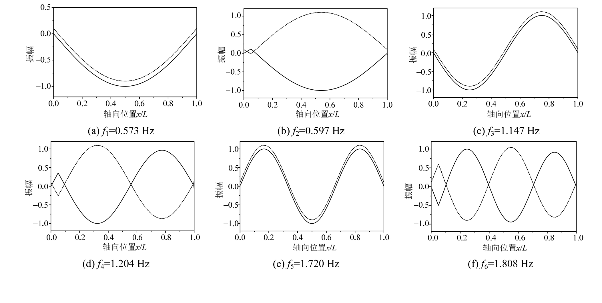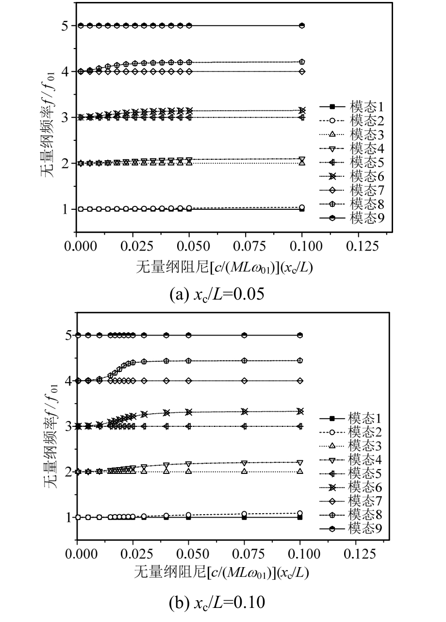 时,第2阶、4阶、6阶、8阶稳定频率与f01的比值分别为1.05、2.10、3.16、4.21;当xc/L=0.10时,比值分别为1.11、2.22、3.33、4.44。