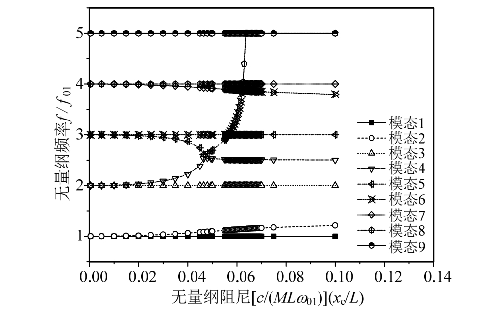 图3给出了在主梁锚固点附近的双索股之间安装单个阻尼器的情况下,双索股-阻尼器结构体系的前9阶结构频率随阻尼器阻尼系数的变化规律,其中xc/L=0.05、0.10。图3中纵坐标中f为结构频率、f01/Hz为单根索股的第1阶频率;横坐标中的