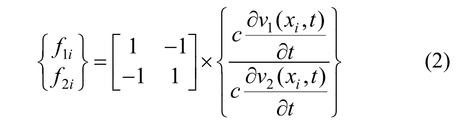 为狄拉克函数;f1i(t)和f2i(t)分别为第i个阻尼器产生的对索股1和2的阻尼力,其大小与阻尼器阻尼系数c、阻尼器安装位置处索股的运动速度有关: