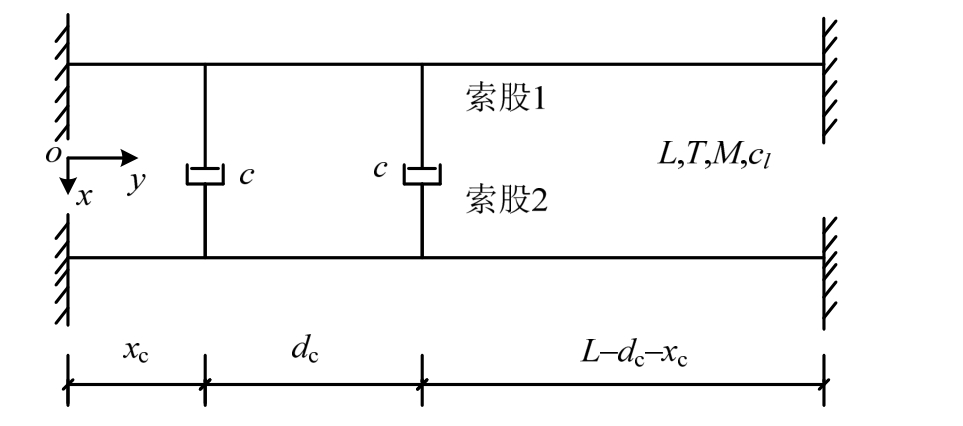索股吊索-阻尼器的结构体系示意图如图 1所示。为便于绘图,将竖向布置的吊索水平绘制,左端为吊索的主梁锚固点。吊索长度为L,单根索股张力为T、单位长度质量为M、单位长度上内阻尼系数为cl。考虑了安装单个、多个阻尼器两种工况。其中,对于安装单个阻尼器工况,阻尼器安装在主梁锚固点附近,离主梁锚固点距离为xc;对于安装多个阻尼器工况,阻尼器安装在等分点位置,间距为dc。建立坐标系xoy,x轴和y轴分别为平行和垂直吊索轴向,原点位于吊索的主梁锚固点处。