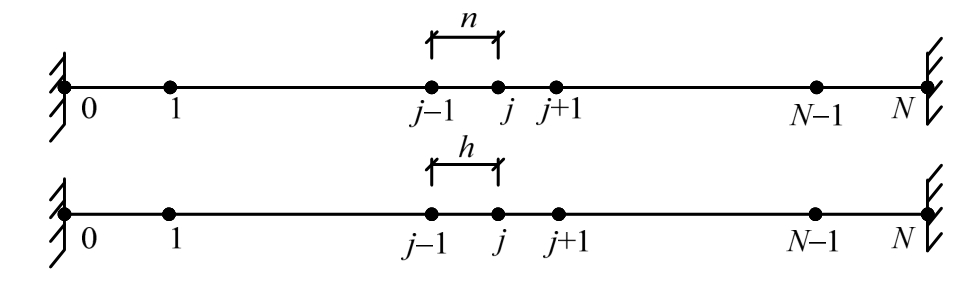 会在阻尼器安装位置处产生一个无穷大的分布阻尼,采用文献[8]提出的一种近似方法进行处理。将索股等分为N段,节点间距h=L/N。节点编号从左至右分别为0~N,其中左端点为0,右端点为N,如图2所示。需要说明的是,需确保阻尼器位于某个节点处。