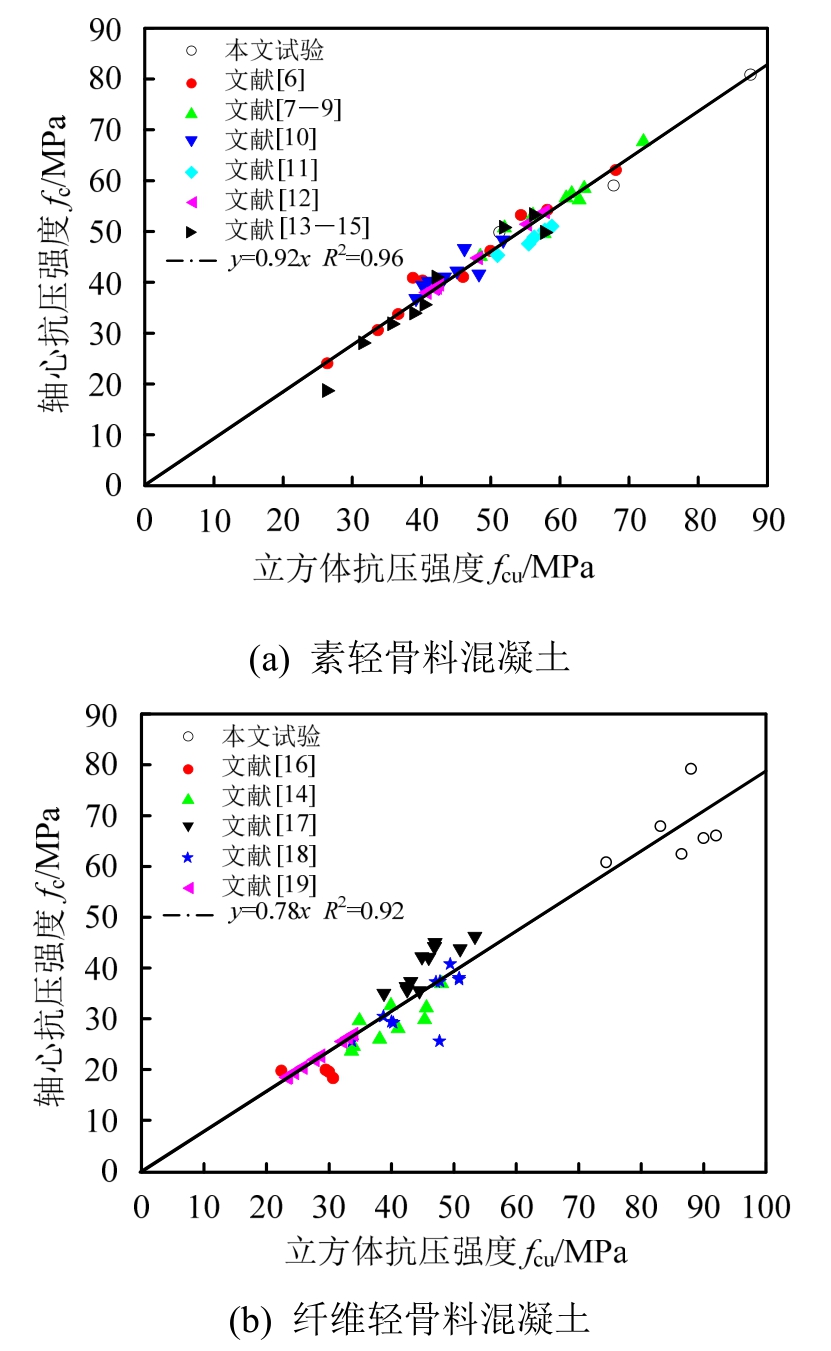 为得到准确的轻骨料混凝土轴心抗压强度与立方体抗压强度的转换关系,在本文试验基础上,收集了52组素轻骨料混凝土和49组纤维轻骨料混凝土试验数据,根据图8中强度的线性变化趋势,回归分析得到轻骨料混凝土的强度换算关系: