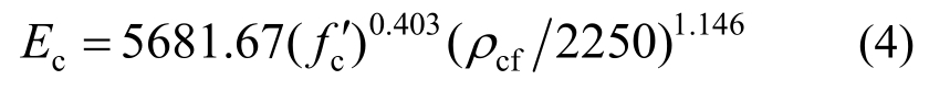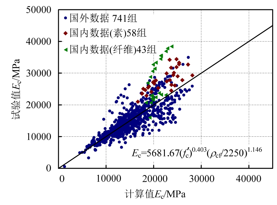 已有研究表明,轻骨料混凝土的弹性模量受混凝土强度和湿表观密度等因素影响显著,而试件截面尺寸、养护方式等对弹性模量影响较小。基于此,本文收集了国内外素轻骨料混凝土和纤维轻骨料混凝土试验数据共842组,通过对大数据回归分析得到弹性模量计算公式: