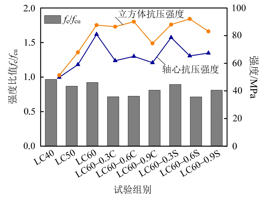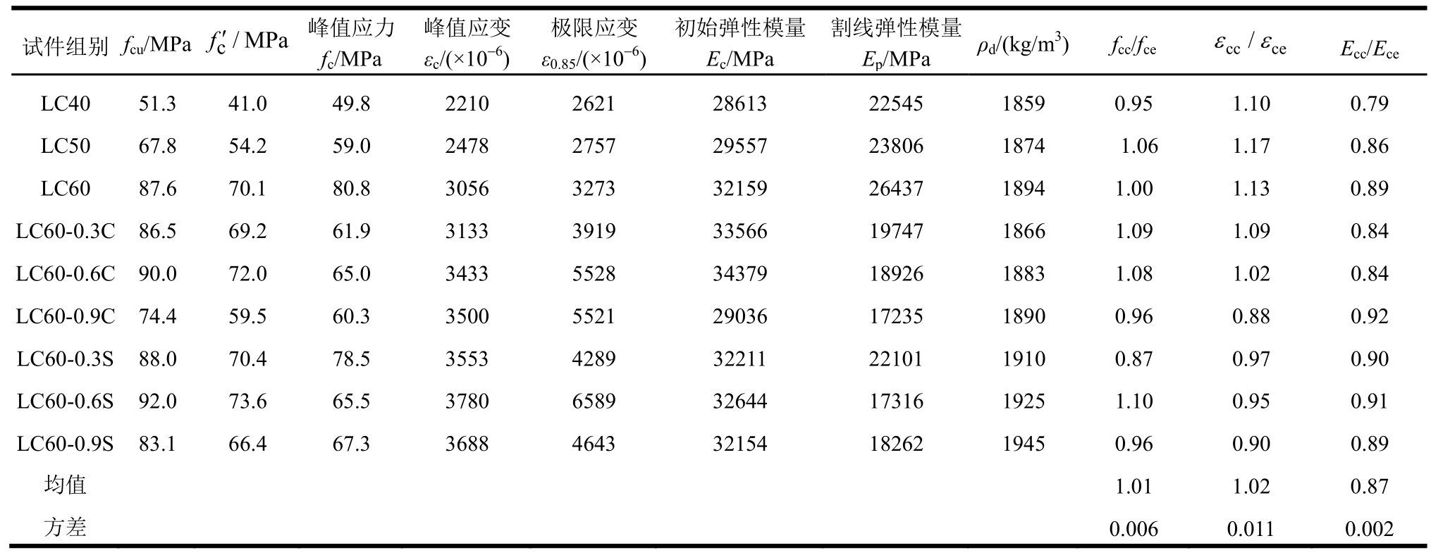 试件组别 f/MPa fc′/MPa 峰值应力cuf/MPa c峰值应变εc/(×10-6)极限应变ε0.85/(×10-6)初始弹性模量Ec/MPa割线E弹/M性P模a量ρd/(kg/m3)fcc/fce cc/cep εε Ecc/Ece LC40 51.3 41.0 49.8 2210 2621 28613 22545 1859 0.95 1.10 0.79 LC50 67.8 54.2 59.0 2478 2757 29557 23806 1874 1.06 1.17 0.86 LC60 87.6 70.1 80.8 3056 3273 32159 26437 1894 1.00 1.13 0.89 LC60-0.3C 86.5 69.2 61.9 3133 3919 33566 19747 1866 1.09 1.09 0.84 LC60-0.6C 90.0 72.0 65.0 3433 5528 34379 18926 1883 1.08 1.02 0.84 LC60-0.9C 74.4 59.5 60.3 3500 5521 29036 17235 1890 0.96 0.88 0.92 LC60-0.3S 88.0 70.4 78.5 3553 4289 32211 22101 1910 0.87 0.97 0.90 LC60-0.6S 92.0 73.6 65.5 3780 6589 32644 17316 1925 1.10 0.95 0.91 LC60-0.9S 83.1 66.4 67.3 3688 4643 32154 18262 1945 0.96 0.90 0.89均值 1.01 1.02 0.87方差 0.006 0.011 0.002