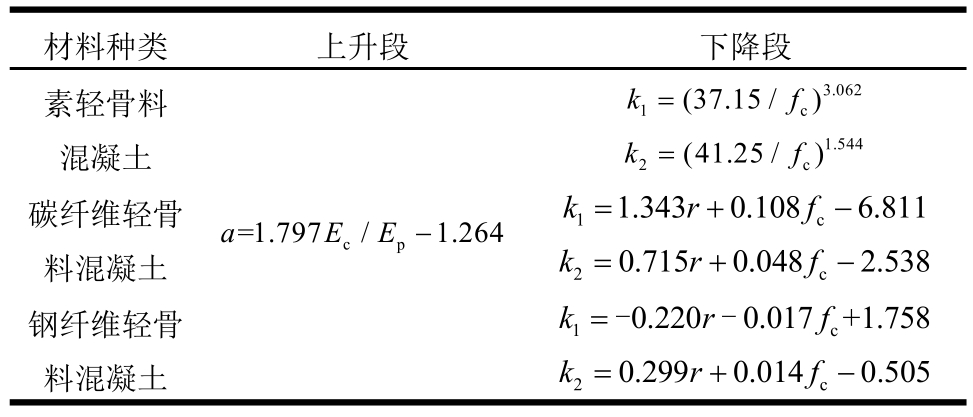 材料种类 上升段 下降段素轻骨料混凝土k=3.062 1 c(37.15/)f k=1.544 2 c(41.25/)f碳纤维轻骨料混凝土=+-钢纤维轻骨料混凝土aEE-=1.797/1.264krf 1=+-1.3430.1086.811 c cp krf 20.7150.0482.538 c krf 1=--0.2200.017+1.758 c krf 2=+-0.2990.0140.505 c