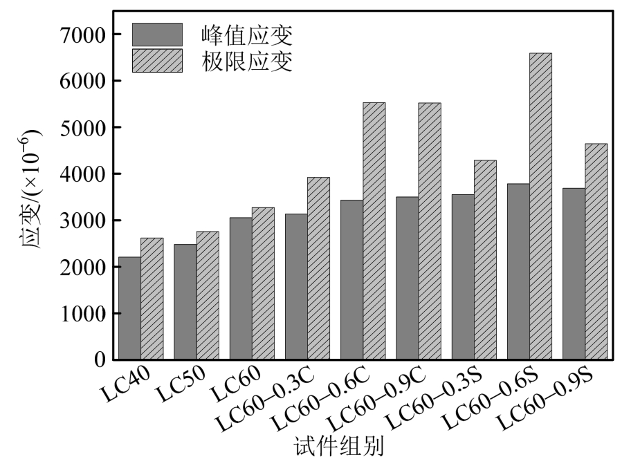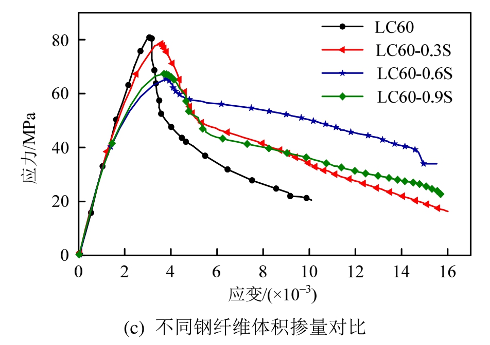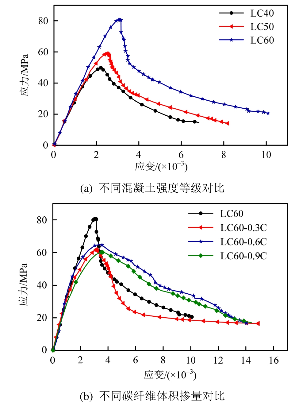 (2) 随混凝土强度等级的提高,轻骨料混凝土峰值应力、峰值应变和弹性模量均得到明显提高;掺入纤维使得轻骨料混凝土的强度略有降低,弹性模量未显著提升,但试件的脆性得到有效改善,且钢纤维的改善效果优于碳纤维,当钢纤维掺量为0.6%或者碳纤维掺量为0.6%~0.9%时,纤维轻骨料混凝土应力-应变曲线下降段坡度明显平缓。