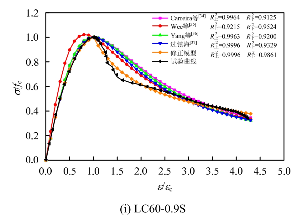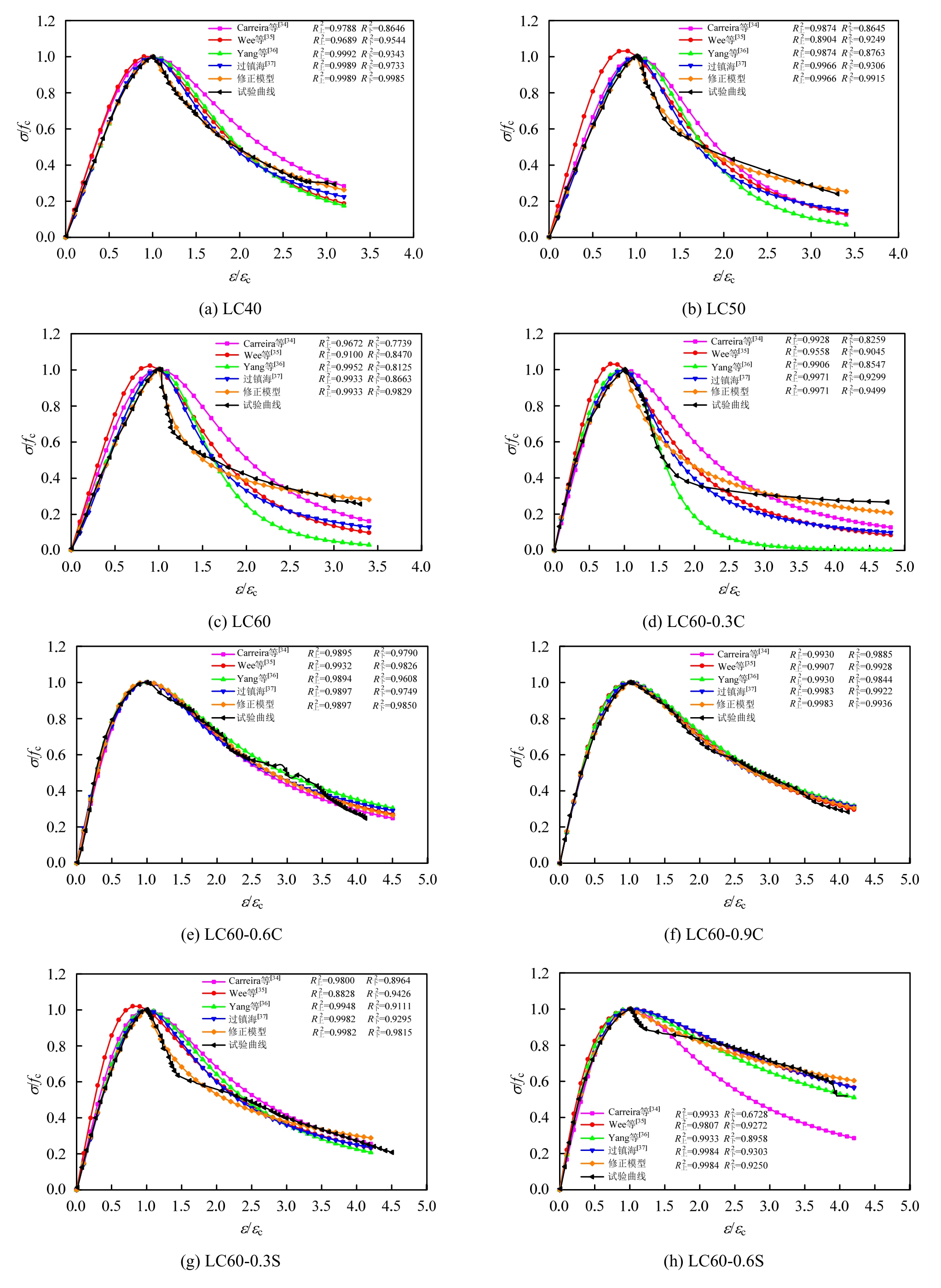 近年来,国内外学者对轻骨料混凝土的力学性能开展了广泛而深入的研究,但对单轴受压本构模型的研究资料仍比较欠缺,难以准确描述轻骨料混凝土的破坏特征,计算结果存在安全隐患。结合4种混凝土单轴受压应力-应变全曲线模型,包括Carreira J模型、Wee TH模型、Yang KH模型和过镇海模型,采用MATLAB软件并结合本文试验和理论分析结果对各试件应力-应变曲线进行拟合,模拟结果及关键参数见表5。