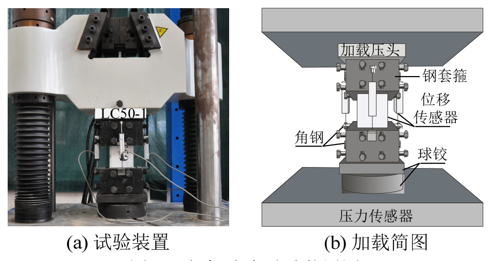 试验在长春产YUL1000电液伺服万能试验机(可施加最大力为1000 kN)上进行,加载简图见图2。因脆性问题轻骨料混凝土应力-应变曲线下降段较陡,难以捕捉,尤其是强度提高后,试验过程对试验机和加载装置要求较高。文中为探寻高强轻骨料混凝土下降段,避免试件发生局部压坏、方便位移传感器的架设,于试件两端1/3范围内安装钢夹具,并将四个位移传感器对称固定于夹具四周,测量试件中部100 mm标距内的轴向变形。加载过程中,荷载值由设备自带力传感系统测量,轴向位移采用DH3820准静态数据采集系统量测,采样频率为10 Hz。加载速率为0.03 mm/min,待试件达到目标位移后停止加载。立方体抗压强度试验按照力控制进行加载,LC40、LC50级轻骨料混凝土试件的加载速率为6 kN/s,LC60级轻骨料混凝土试件的加载速率为10 kN/s,试验结果见表3。