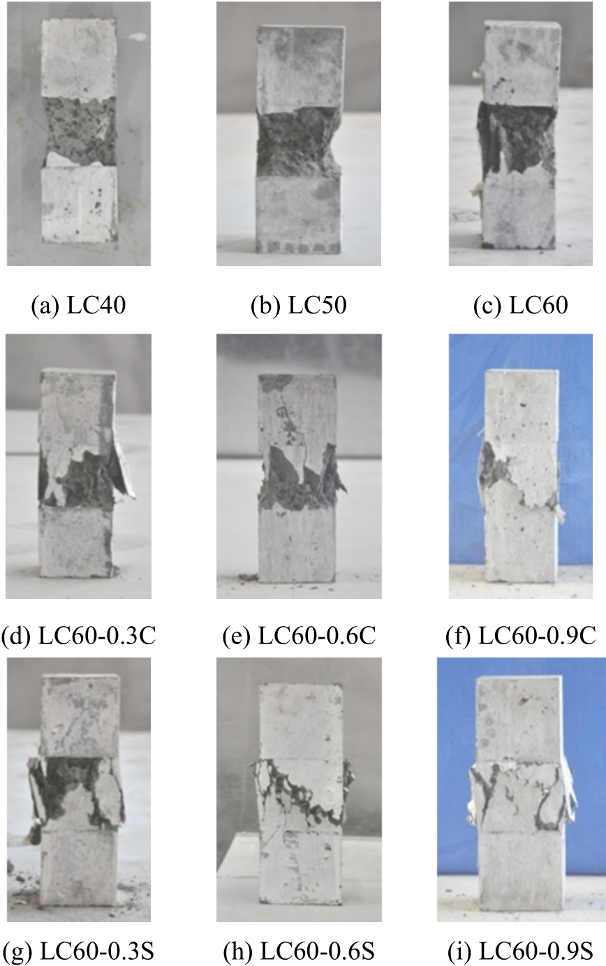 4) 破坏阶段:当荷载降至60%~70%峰值荷载后,试件轴向变形不断增大,但承载力降低速率减缓,裂缝进一步发展形成的破坏带逐渐增宽,直至试件中部混凝土发生压溃破坏。相比普通混凝土,轻骨料混凝土破坏面处劈裂骨料数量较多,且骨料与胶凝体界面处存在较多裂缝。对于钢纤维轻骨料混凝土而言,该阶段内可听见明显的纤维拔出声,破坏面处纤维均匀散布于试件中,劈裂骨料数目相对减少,试件达目标位移时残余承载力较高。各组试件典型破坏形态如图3所示。