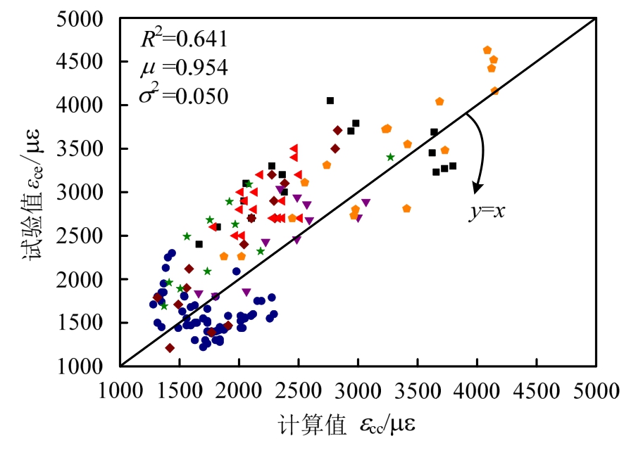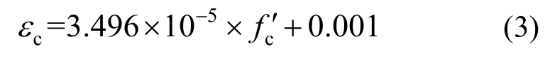 峰值应变作为混凝土单轴受压本构模型的关键参数之一,主要受混凝土强度、截面尺寸、加载速率和约束条件等因素影响。因轻骨料混凝土自身弹性模量较小,相同强度等级下的峰值应变较普通混凝土大,因此,已有的普通混凝土峰值应变计算公式不再适用。本文收集了150组轴压荷载作用下轻骨料混凝土试验数据[3,20―33],考虑其峰值应变与混凝土强度存在线性关系,通过回归分析得到峰值应变计算公式如下: