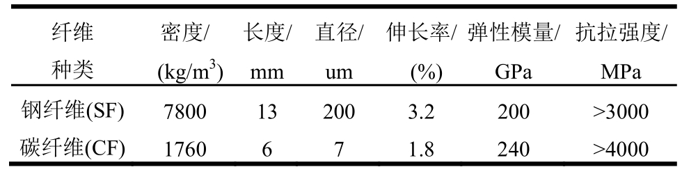 纤维种类密度/(kg/m3)长度/mm直径/um伸长率/(%)弹性模量/GPa抗拉强度/MPa钢纤维(SF)7800 13200 3.2 200 >3000碳纤维(CF)1760 6 7 1.8 240 >4000