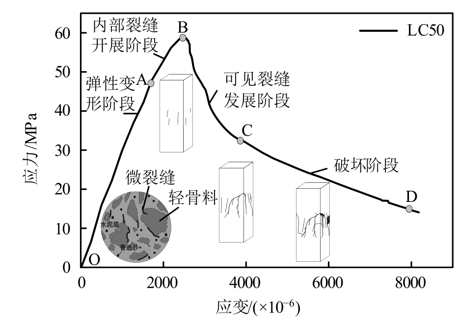 与普通混凝土类似,轻骨料混凝土试件在单向轴压荷载作用下经历了弹性变形、内部裂缝开展、可见裂缝发展和破坏四个阶段,但在各阶段内的破坏机理和破坏现象与普通混凝土试件存在差别,具体试验现象如下: