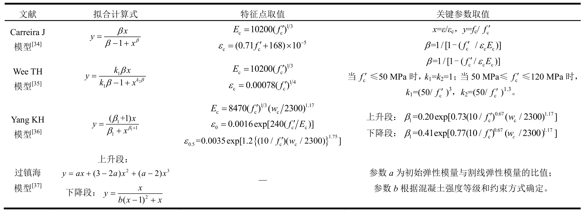 文献 拟合计算式 特征点取值 关键参数取值Carreira J模型[34]yxβ=-+βx E=f′13 c c 10200()x=ε/εc,y=fc/fc′β1ε=+×-5 c (0.71168)10 f′c β=1/[1(/)]-fE ccc′ε E=f′β=1/[1(/)]10200()-fE ccc ykx kxβ′ε Wee TH模型[35]=-+1β 13 c c 11k β 2 ε=14 c c 0.00078(f)′当fc′≤50 MPa时,k1=k2=1;当50 MPa≤fc′≤120 MPa时,k1=(50/fc′)3,k2=(50/fc′)1.3。E=f′w 8470()(2300)Yang KH模型[36]y(+1)x xβ+1=+β 131.17 c cc 上升段:0.671.17 β=0.20exp[0.73(10/)(/2300)]1 ε=0.0016exp[240(fE)]fw cc cc 1′0 β′1 1 ε}1.75 0.5cc=0.0035exp[1.2(10/)(/2300)]{fw′下降段:0.671.17 β=0.41exp[0.77(10/)(/2300)]1 fw c ′c过镇海模型[37]上升段:yaxaxax=+-+-下降段:(32)(2)2 3 ybxx=-+x(1)2— 参数a为初始弹性模量与割线弹性模量的比值;参数b根据混凝土强度等级和约束方式确定。