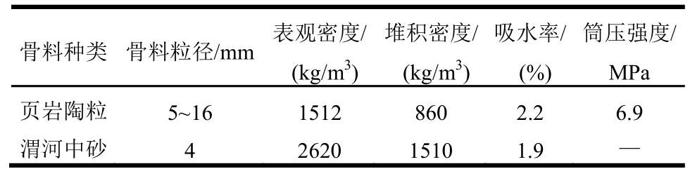 骨料种类骨料粒径/mm表观密度/(kg/m3)堆积密度/(kg/m3)吸水率/(%)筒压强度/MPa页岩陶粒5~16 1512 860 2.2 6.9渭河中砂4 2620 1510 1.9 —