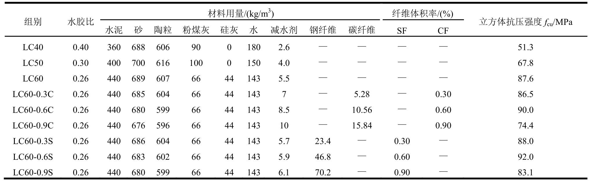 注:以试件组别LC60-0.3C为例,其中LC代表轻骨料混凝土,60为混凝土强度等级,0.3代表纤维掺量为0.3%,C代表碳纤维(S代表钢纤维)。