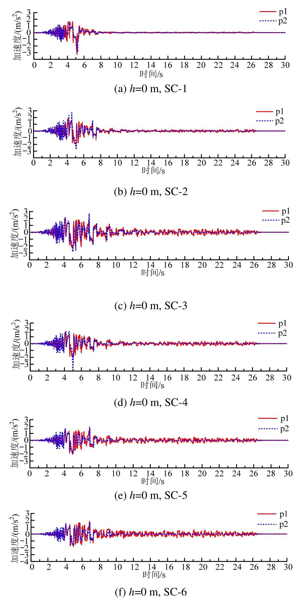 场地地表p1和p2点在不同工况下的加速度响应时程如图11所示。非加固的自由场p2点地表位置在SC-1~SC-6六个工况都达到了液化,在初始液化后加速度响应衰减明显,即土体抗剪切能力衰减明显。加固区内p1点的地表位置在SC-1~SC-6六个工况也都达到液化或短暂接近液化,但加速度保持着一定的震动幅度,土体相对密度越大加速度衰减越少,震动强度较低时加速度的衰减较少。碎石桩加固虽然未能阻止 p1点地表位置的液化,但因提高加固区的整体刚度、改善下层土体受力性能,提高了其液化势或抗液化能力,因此 p1点地表相对 p2点在液化后保持有更强的往返活动性与震动加速度响应,土体抗剪切能力得到加强。