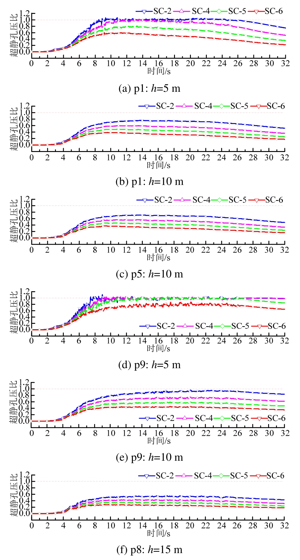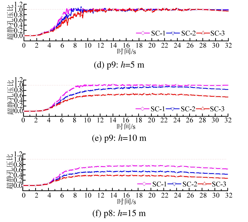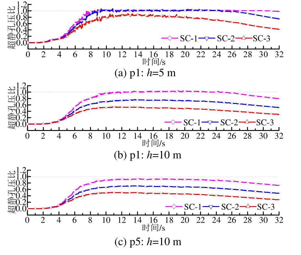 在震动强度amax分别为 0.37 g、0.30 g、0.25 g和0.20 g的SC-2、SC-4、SC-5、SC-6工况下,加固区内部和外部不同位置、不同深度的超静孔压比时程曲线如图10所示。从图10可见,在5 m深度处 p9点 SC-2、SC-4、SC-5工况均达到液化,且SC-2、SC-4工况液化状态持续至震动结束,而SC-5工况下孔压在震动持续时即缓慢降低,液化向浅层消退。在5 m深度处p1点SC-2、SC-4工况达到液化并在震动结束前孔压消散离开液化状态,其他工况则未达到初始液化。在10 m深度,各工况在p9、p1、p5点均未达到液化,且明显加固区内的孔压比低于加固区外的孔压比,加固区内距离碎石桩近位置的孔压比低于距桩远位置的孔压比。在 SC-6工况下,5 m及以下均未达到初始液化;从计算结果,SC-6工况加固区外的p9和p3点液化深度约为4 m,加固区内除桩间土浅层1 m~2 m的少量部位外基本未出现土体液化。分析可见,地震动强度对碎石桩加固可液化场地的超静孔压影响显著,震动强度越大,各位置的超静孔压比越大,土层液化越深。