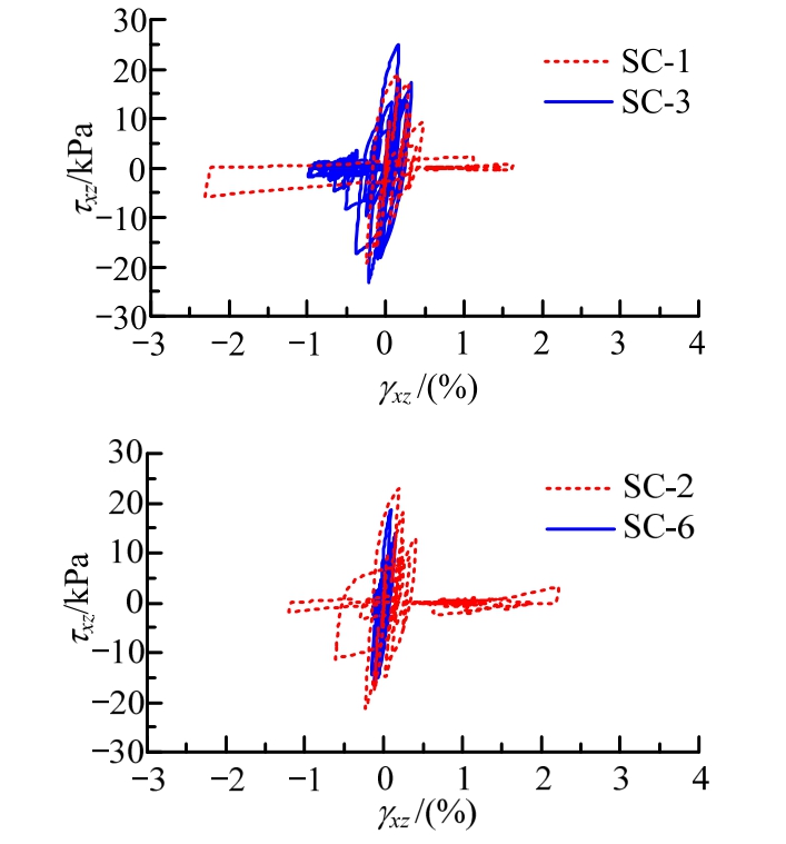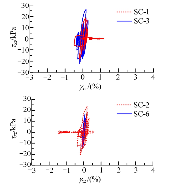 加固区和非加固区的不同位置5 m深度处的剪应力-剪应变(τxz~γxz)响应对比如图12~图14所示。从图可见,土体的大剪应变发生在初始液化后的零剪应力状态与往返活动性时的低剪应力状态;未固区p3和p9点的剪应变响应大于加固区内p1点的剪应变响应,表明碎石桩加固有助于降低可液化土体的剪应变响应,且对其边缘的非加固区土体的剪应变响应降低也有所帮助;砂土相对密度较大工况的剪应变响应小于相对密度较小工况的剪应变响应,而剪应力则相对密度越大产生的剪应力响应越大。SC-6工况在5 m深度未出现初始液化,处于小应变阶段,与图10超静孔压比所示相符合。