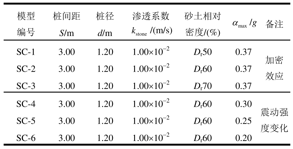 土体液化复杂力学行为本身需要精细和合理的描述,是岩土领域研究的热点之一[1],而碎石桩为散体材料桩,其力学特性和变形又会受到周边土体围压与变形的影响,因此,可液化场地中碎石桩复合地基的动力响应研究就更为复杂。碎石桩复合地基的变形、应力、孔压变化等动力特性还有很多待研究之处,如:复合地基变形及孔压空间变化特征,周边未加固土体发生震动液化对碎石桩加固区边缘与中间部位的抗液化效果的影响,及桩土应力分配变化等。