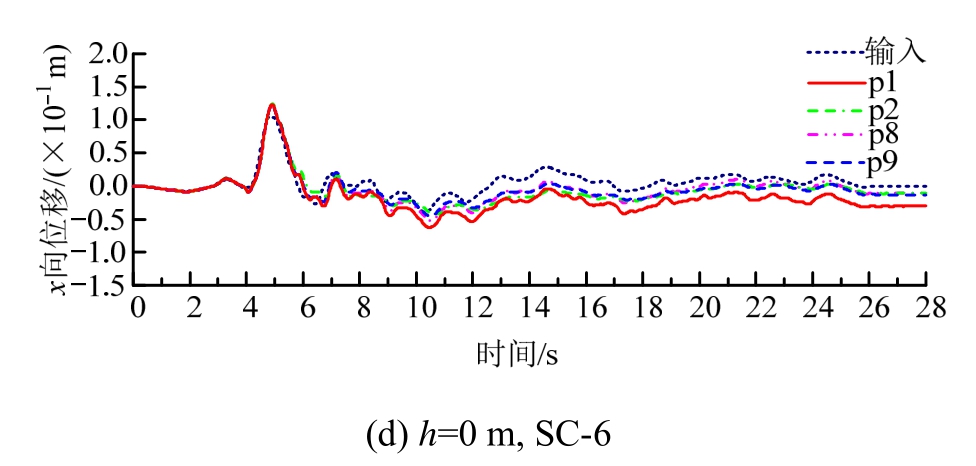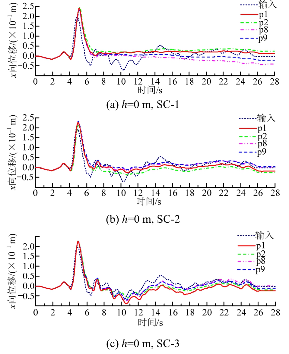 加固区和非加固区的地面在不同位置x向位移时程及震动输入位移时程的比较如图18所示。从图18可见,在震动前期阶段,地面不同点基本上随基底输入震动而同步震动,侧向位移的振幅则有所放大,砂土相对密度较低时振幅放大较多,如p1点位置在 SC-1和 SC-3工况的侧向位移分别为24.15 cm和 22.51 cm,放大系数分别约 23.6%和15.2%。在震动过程进行且场地逐步接近液化或出现初始液化后,地表点的震动与‘’基底震动逐步出现偏离,不同位置震动偏离出现有先有后,偏离基底震动的分布则不同工况响应不统一。砂土较密或震动强度较低时,地表震动保持与基底震动相似的震动形态程度越高,此点与图11所示加速度响应相符合。