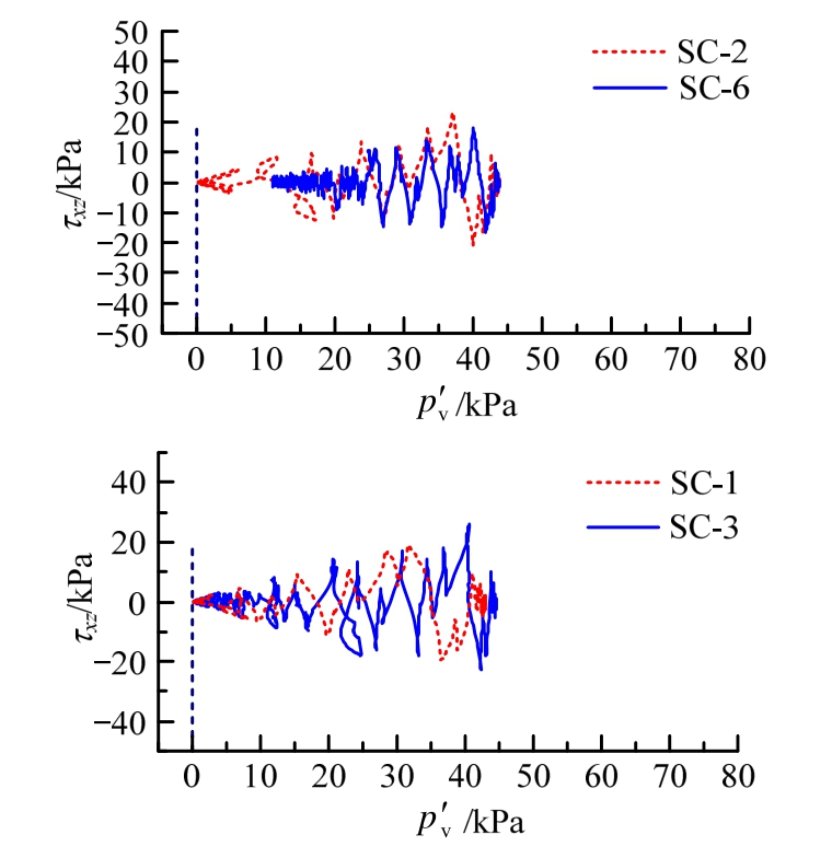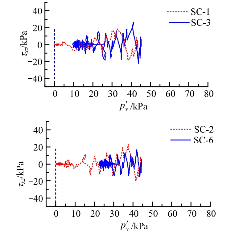 路径的模拟结果对比如图15~图17所示。未加固区自由场p3点在5 m深处SC-1、SC-3、SC-2工况均达到零剪应力的液化状态,土体相对密度较高的工况经过更多次的震动循环才达到初始液化,而 SC-6工况因震动强度较低未达到初始液化。加固区 p1点在5 m深处SC-1、SC-2达到液化,且与p3点相比,经过多几次震动循环才达到初始液化状态,而SC-3/6则未达到液化。在加固区p5点的10 m深处4个工况均未达到液化。从图15~图17可见:1)土体相对密度高的工况中剪应力响应峰值较大,土体的剪应力比峰值较大,即剪应力与有效球应力之比的峰值较大;2)SC-2与SC-6工况对比显示在土体相对密度相同时,震动强度较高时土体中剪应力响应峰值较大;3)在相同部位,土体相对密度较大、震动强度较小的工况中有效球应力的衰减较少。