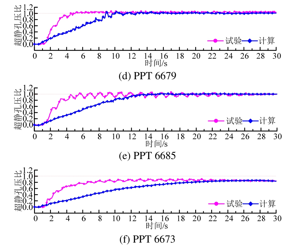 之比。试验和模拟显示在 10 m以上相应位置都达到了初始液化(ru=1.0),而在PPT6673位置(约深18 m)超静孔压比达到约 ru ≈ 0.84,未达到初始液化。模拟值在浅层部位(约5 m以上)与试验值超静孔压产生和液化基本同步,液化从浅层逐步向深层发展,与试验相符,而试验向深部液化发展时速度稍快。