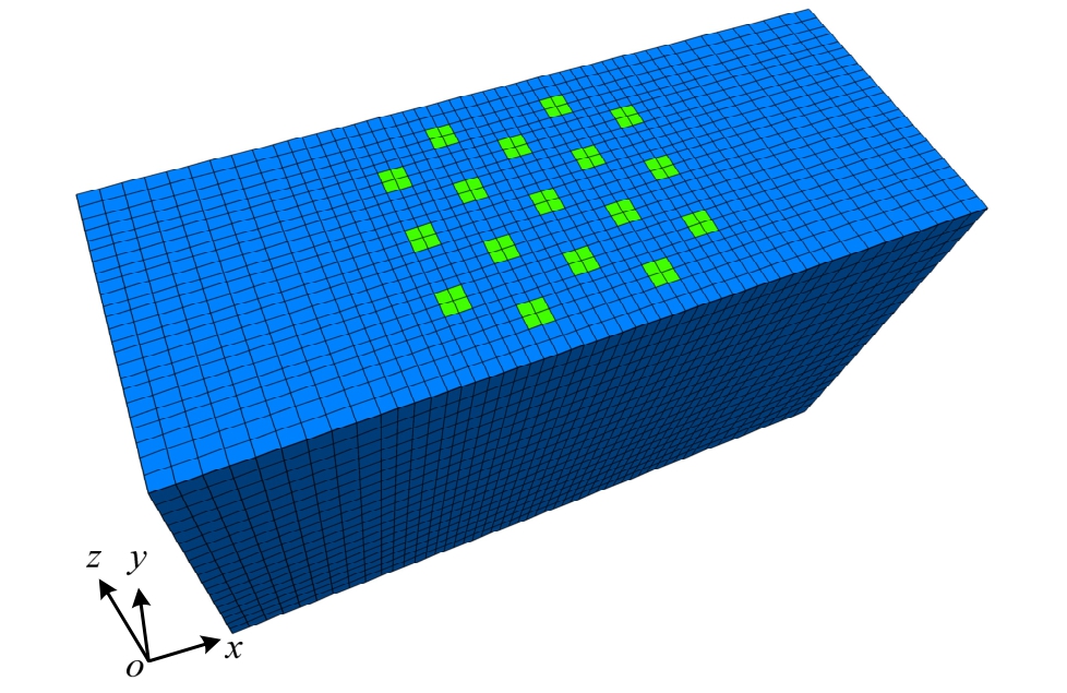 模拟ABJ-8a试验的平面布置和网格划分如图3所示,长 33.6 m,宽 12.6 m,高 19 m,共 23712个单元(zones)。试验中的碎石桩截面为圆形,桩径d为1.2 m,桩间距S为3.0 m。计算中按照桩截面面积等效为正方形桩分析,边长为1.07 m,桩中心之间距离 3.0 m。因试验中饱和溶液采用了 50 cSt