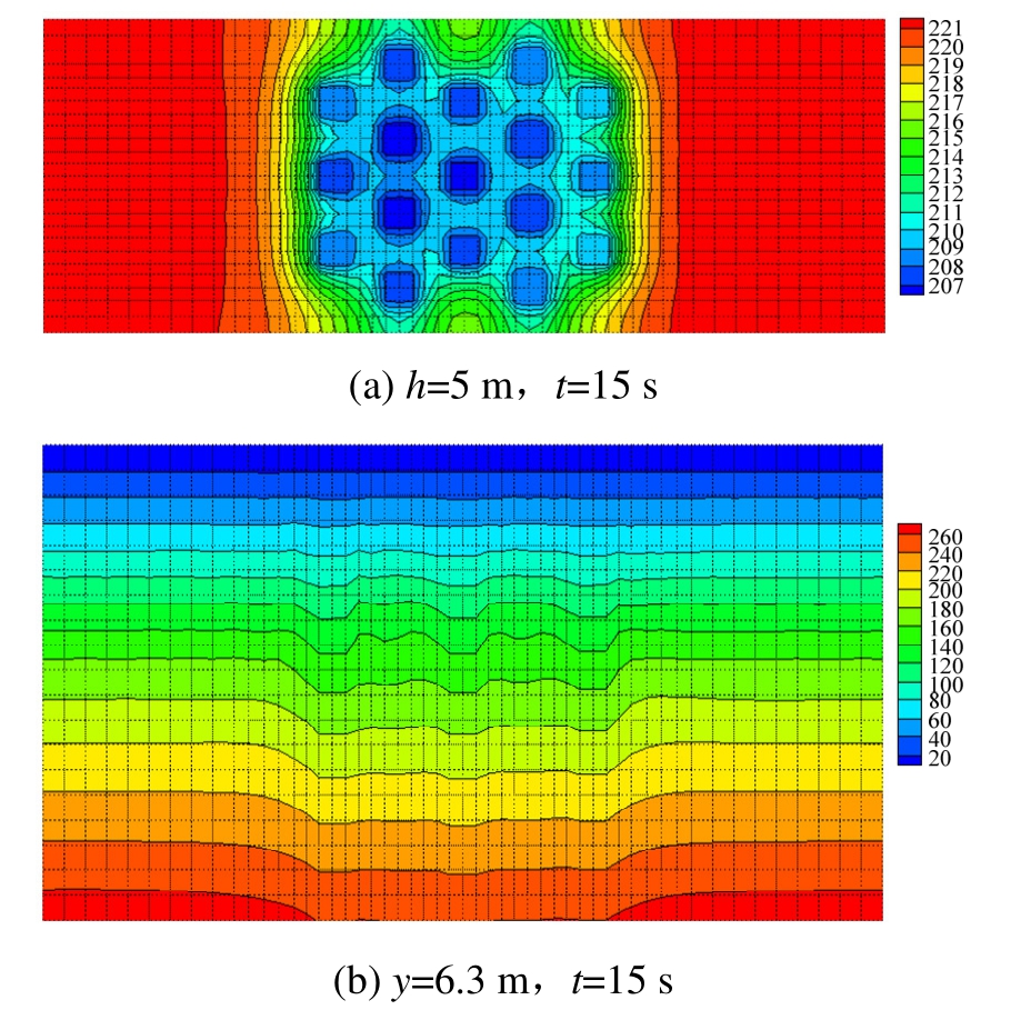 图9所示为SC-2工况下,h=5 m深度和y=6.3 m剖面在t=15 s及30 s时的超静孔隙水压力等高线示意图。从图9(a)与图9(c)可见,加固区外约2 m~3 m范围内孔压梯度较陡而等高线分布密集,加固区内则孔压较低且梯度分布较缓,碎石桩加固明显降低了超静孔压累积,有益于改善加固区内土体抗液化效果。在t=15 s震动较强时桩周附近孔压及其梯度大于在t=30 s时,碎石桩周边的土体孔压在强震过后震动持续时就在快速消散。从图9(b)与图9(d)可见:1)碎石桩排水的抗液化有效影响范围至加固区外约2.5倍~3倍桩径,在浅层小而随深度增加;2)在深层部位孔压有较大幅度消散时,浅层部位消散较少,深层部位孔压消散快于浅层部位;3)中间桩区域的孔压消散明显快于外围桩区域的孔压消散;加固区外的超静孔压向碎石桩消散,外围桩发挥着加固区排水屏障和非加固区排水通道的作用。由此,在碎石桩加固处理可液化场地时,增强围护桩的排水效果,如:加大桩径或加密布桩及保持其排水通道畅通,有利于提高加固区的整体抗液化效果。