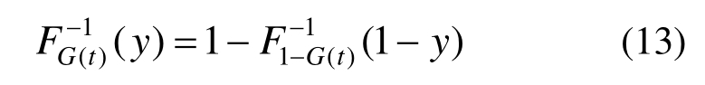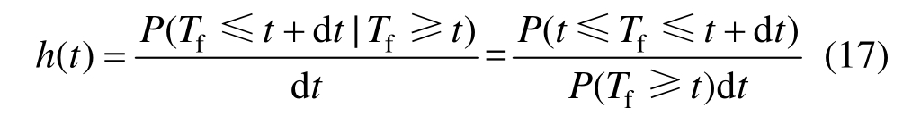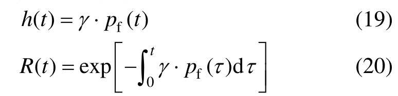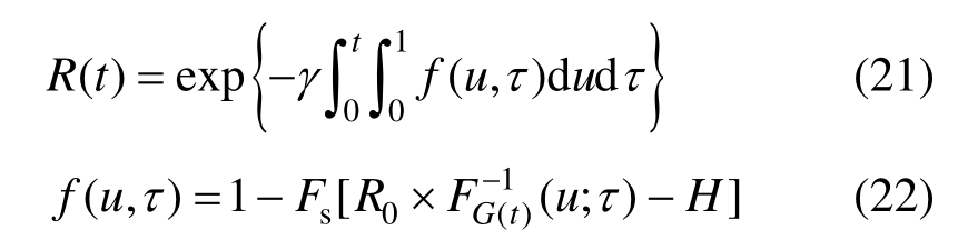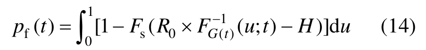 由于式(12)积分式的上下限都是无穷,特别在后文考虑抗力和恒载的随机性时,数值积分较为困难,因此本文首先对其进行参数变换[20],即令u = F G (t)(y;t ),则 y ∈ (-∞ ,+∞ )等效于u∈(0,1),使其积分上下限变为(0,1),由此,瞬时失效概率可由式(14)计算:为推导相关的可靠度计算公式,引入危险函数概念[13],其定义为结构在[0,t]时间范围内没有失效的条件下,在[t,t+dt]时间范围内的失效概率,危险函数h(t)与可靠度函数R(t)之间的关系为: