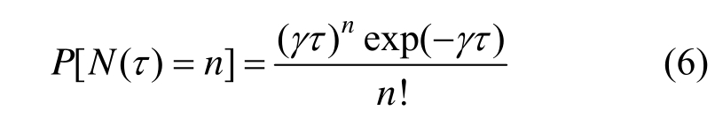 一般情况下,桥梁活载主要考虑车辆荷载,其本质上属于非平稳随机过程。文献[18]指出,密集分布的车辆荷载出现在桥梁上的持续时间非常短,而且出现的时间间隔可以认为服从指数分布,因此,本文车辆荷载采用复合泊松过程描述。根据复合泊松过程模型,在任一时间长度区间τ内,通过车辆荷载的次数N()τ为n次的概率为[19]: