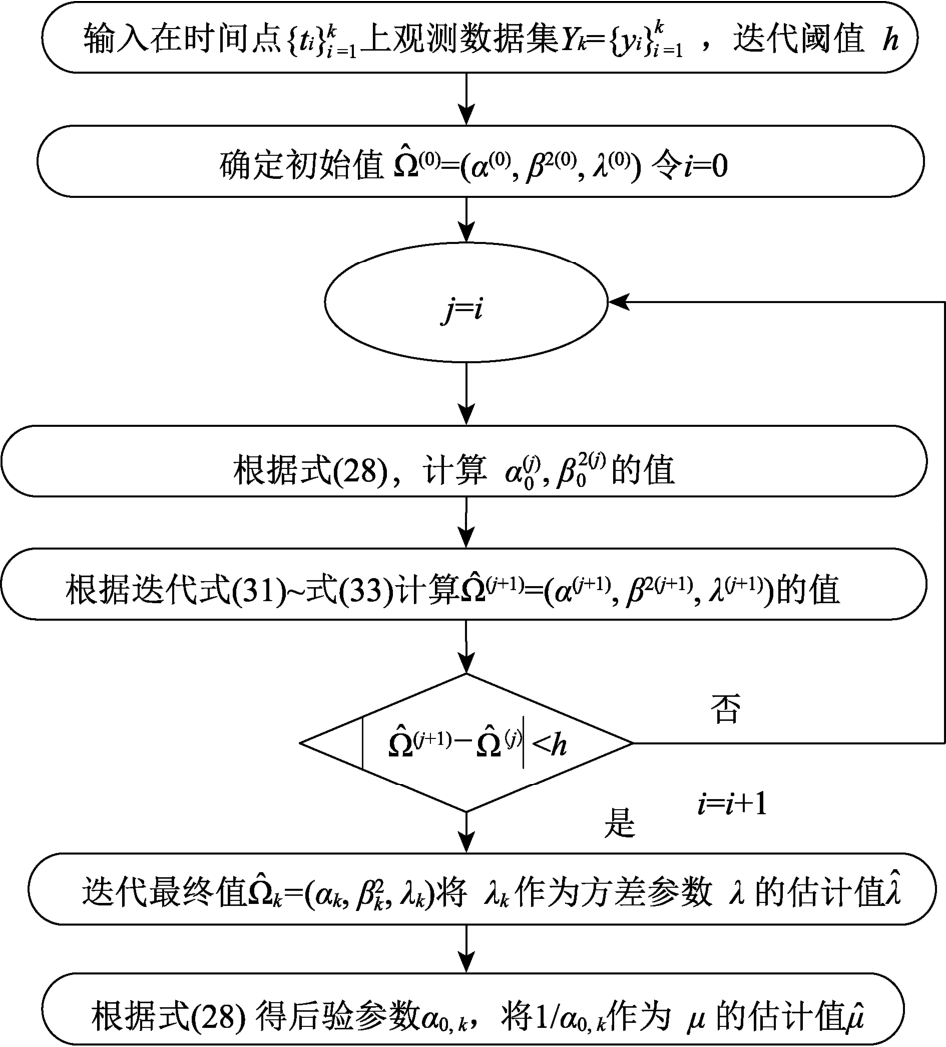 的差小于给定阈值h时,即认为迭代收敛,最后一次的估计结果即为基于退化数据集Yk的参数估计值。图4给出了基于Bayesian更新与EM算法的逆高斯过程模型参数估计流程图。