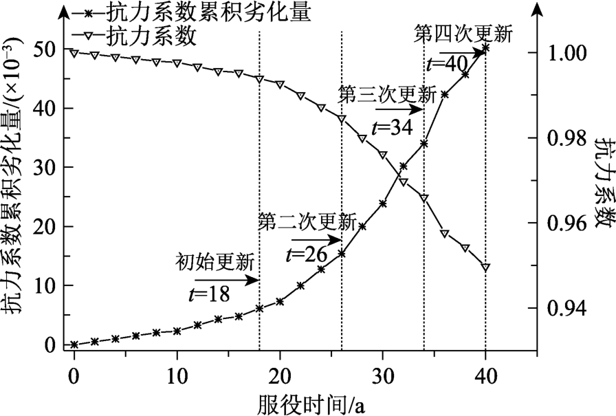 针对此服役40年的钢筋混凝土T型梁桥,采用获得的服役期抗力退化数据,分别选择在四个时间点(即服役期分别为18年、26年、34年和40年时),根据图4给出的基于Bayesian更新与EM算法的逆高斯过程模型参数估计流程,分别获得此四个时刻更新的逆高斯过程抗力退化模型参数,如表2所示。从表2中可以看出,随桥梁服役时间增加,指数参数q从1.0增加到2.0,这主要是考虑到钢筋混凝土中钢筋锈蚀产生锈胀裂缝将加速钢筋混凝土桥梁的抗力退化的工程经验,并结合实际检测的抗力退化数据综合确定的。