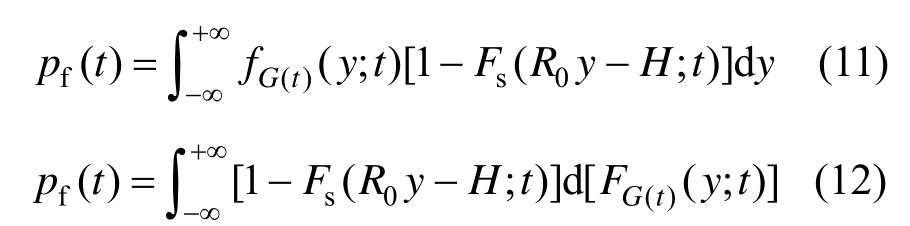 式中:S(t)为车辆荷载;G(t)为抗力退化系数;H为恒载。由此得到t时刻结构的瞬时失效概率为: