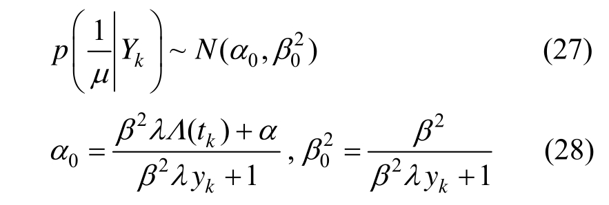 由式(24)、式(25)可知1/μ的后验分布也服从正态分布族,如式(26)、式(27)所示,因此参数1/μ的共轭先验分布是正态分布,其先验分布的选取是合理的。