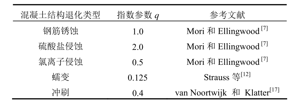 混凝土结构退化类型 指数参数q 参考文献钢筋锈蚀 1.0 Mori和Ellingwood [7]硫酸盐侵蚀 2.0 Mori和Ellingwood [7]氯离子侵蚀 0.5 Mori和Ellingwood [7]蠕变 0.125 Strauss等[12]冲刷 0.4 van Noortwijk 和 Klatter[17]