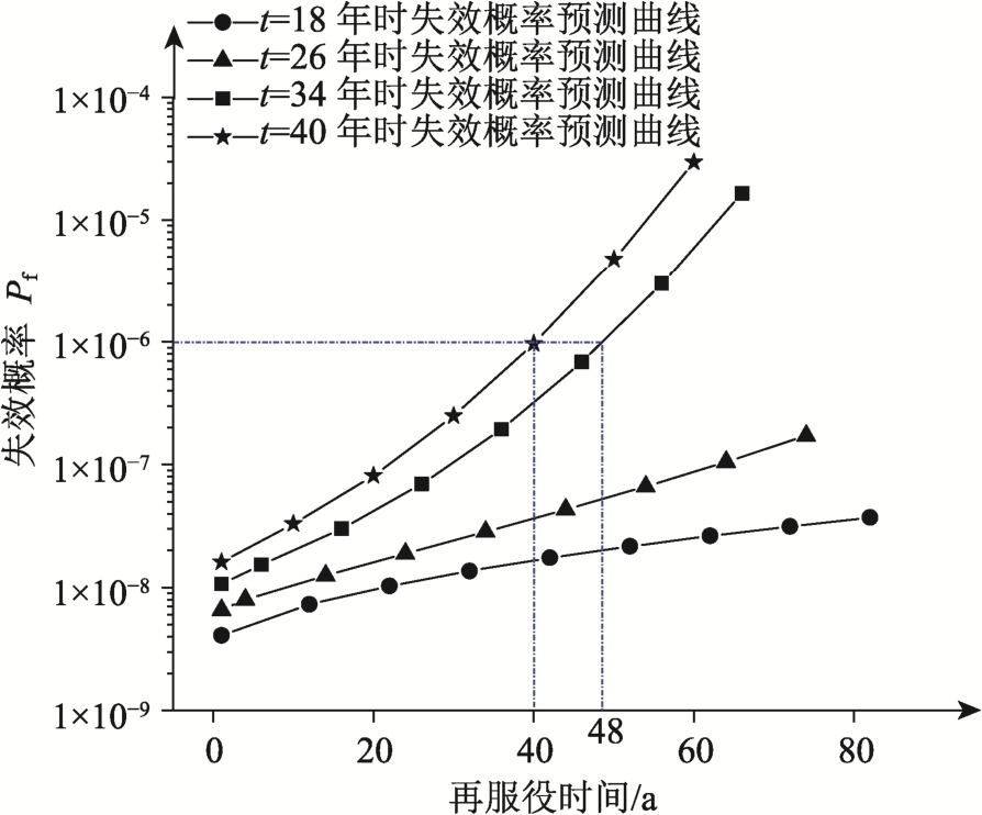 基于图5的流程图,预测得到该T梁分别在服役期为18年、26年、34年和40年时的失效概率曲线,如图 10所示,图中横坐标表示从预测的服役时刻开始,再继续服役的年限。从图 10中可以看出,随桥梁服役时间增加,T梁的失效概率不断增大。当设定T梁的目标失效概率为 1 × 1 0-6时,分别根据服役期为18年、26年时预测得到的失效概率曲线,可判定该T梁桥满足设计使用寿命100年的要求;分别根据服役期为34年、40年时预测得到的失效概率曲线,可推断该T梁桥再服役48年、40年失效,即该T梁桥的预期使用寿命分别为82年、80年,不满足设计使用寿命100年的要求。