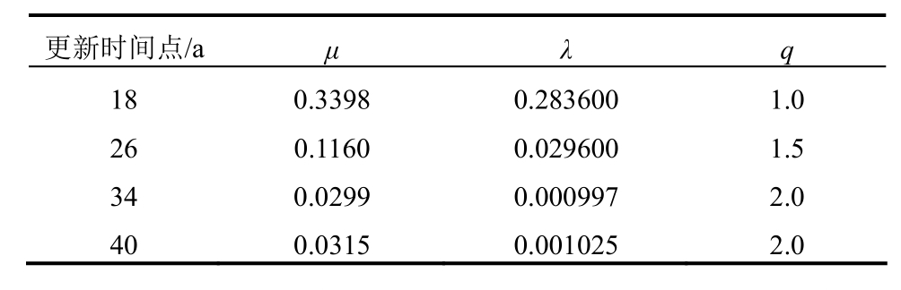 更新时间点/a μ λ q 18 0.3398 0.283600 1.0 26 0.1160 0.029600 1.5 34 0.0299 0.000997 2.0 40 0.0315 0.001025 2.0