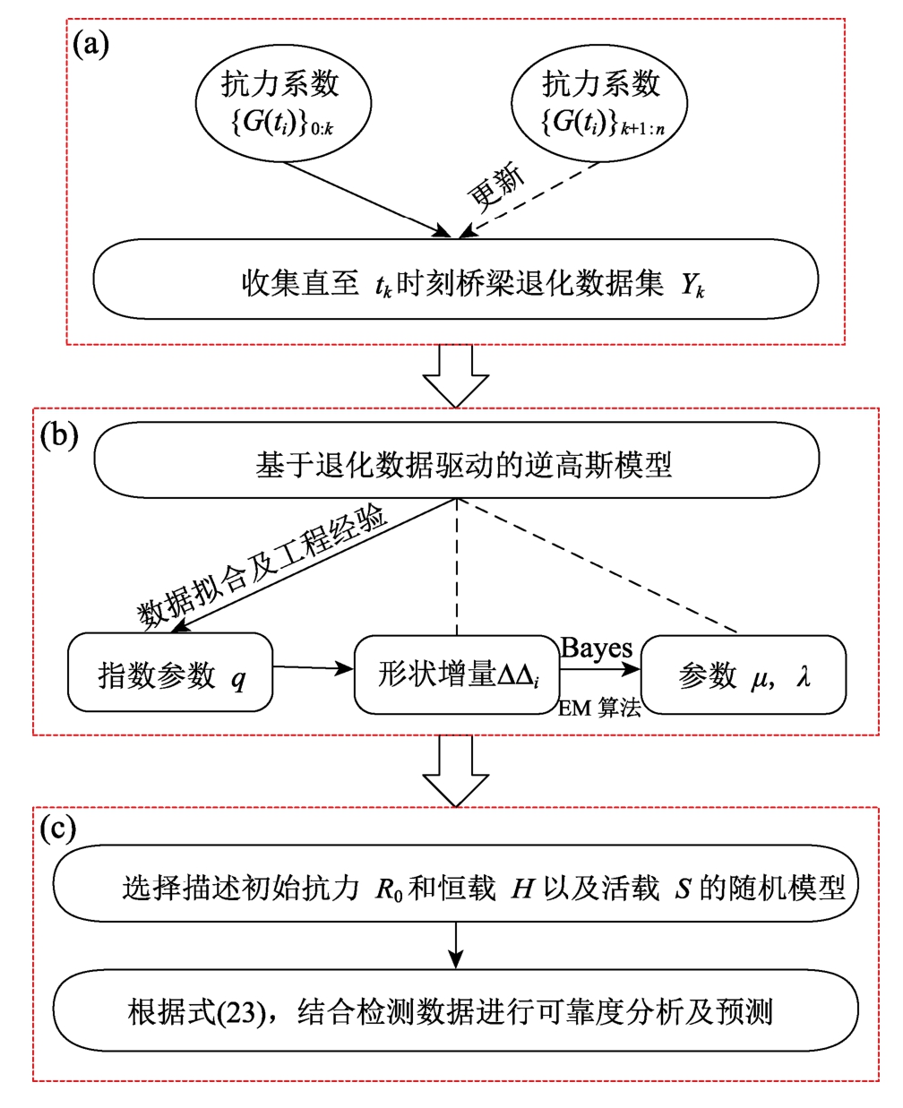 依照上述参数估计方法,本文旨在结合桥梁在服役过程中的检测数据,构建一种桥梁构件可靠度动态分析框架,能够准确地预测桥梁的剩余使用寿命。其主要流程分三大部分: