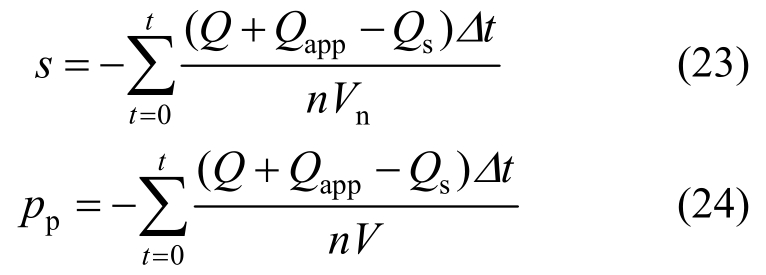 岩体吸水后将对表征元的渗流过程发生影响,当前时步的节点饱和度公式s及节点孔隙水压力公式 pp需要调整为[23―25]: