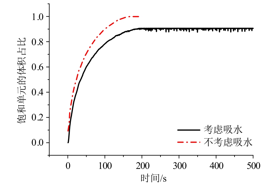 令饱和单元的体积占比=某时刻达到饱和的单元体积总和/试样体积,则该占比随时间的变化如图8所示。由图可得,不考虑基质吸水时,所有单元均可达到饱和状态;考虑基质吸水时,仅有约90%的体积长期处于饱和状态,且因基质吸水速度与单元内含水量间的动态平衡关系,饱和单元体积占比将在总体平衡的形势下出现局部范围的波动。