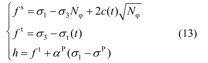 根据试探应力张量 σij计算当前时步的主应力σ1、σ2及 σ3,根据式(13)判断该应力状态是否已经达到或超过 Mohr-Coulomb准则及最大拉应力准则: